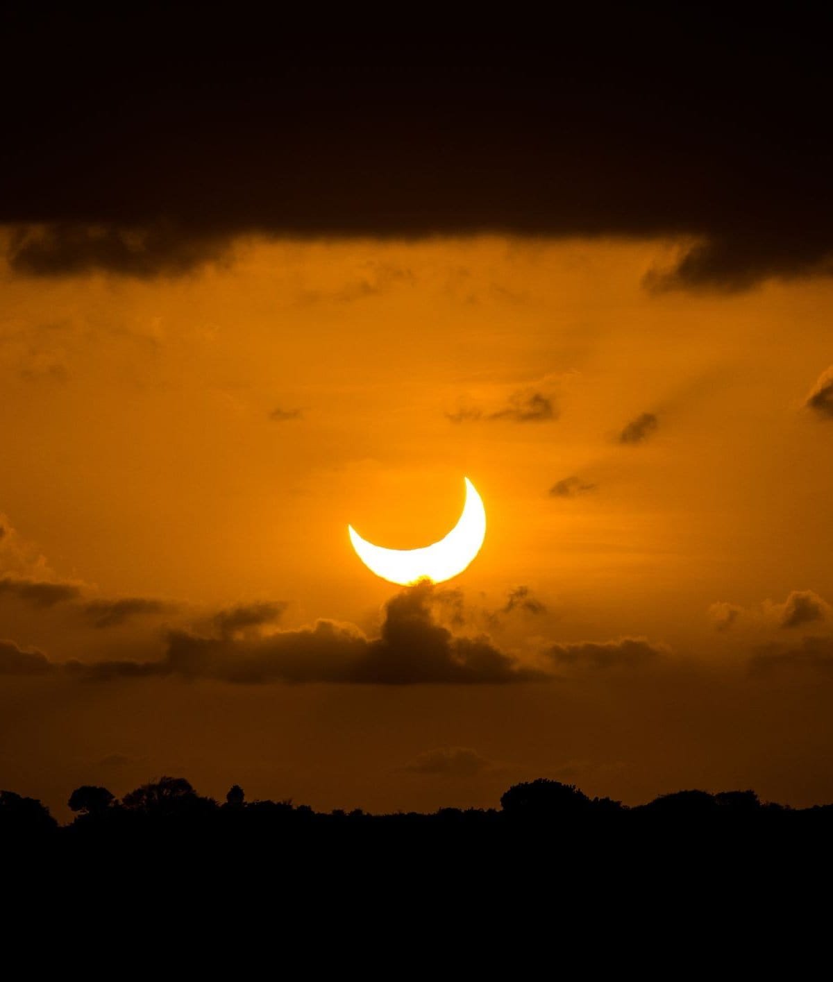 No caso de um eclipse solar parcial, a Lua passa entre o Sol e a Terra, mas esses corpos celestes não estão perfeitamente alinhados. Por isso, ocorre apenas um encobrimento parcial da superfície solar. Assim, o Sol costuma ganhar a aparência de uma fina faixa em forma de crescente, parecendo uma meia-lua.