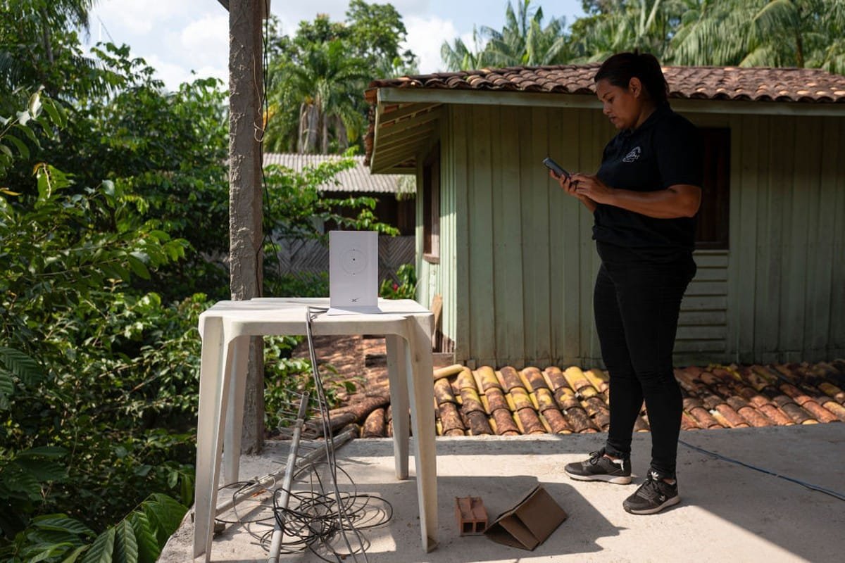 Funcionária configura um roteador da Starlink para fornecer internet a uma loja de chocolates na Ilha do Combu, em Belém